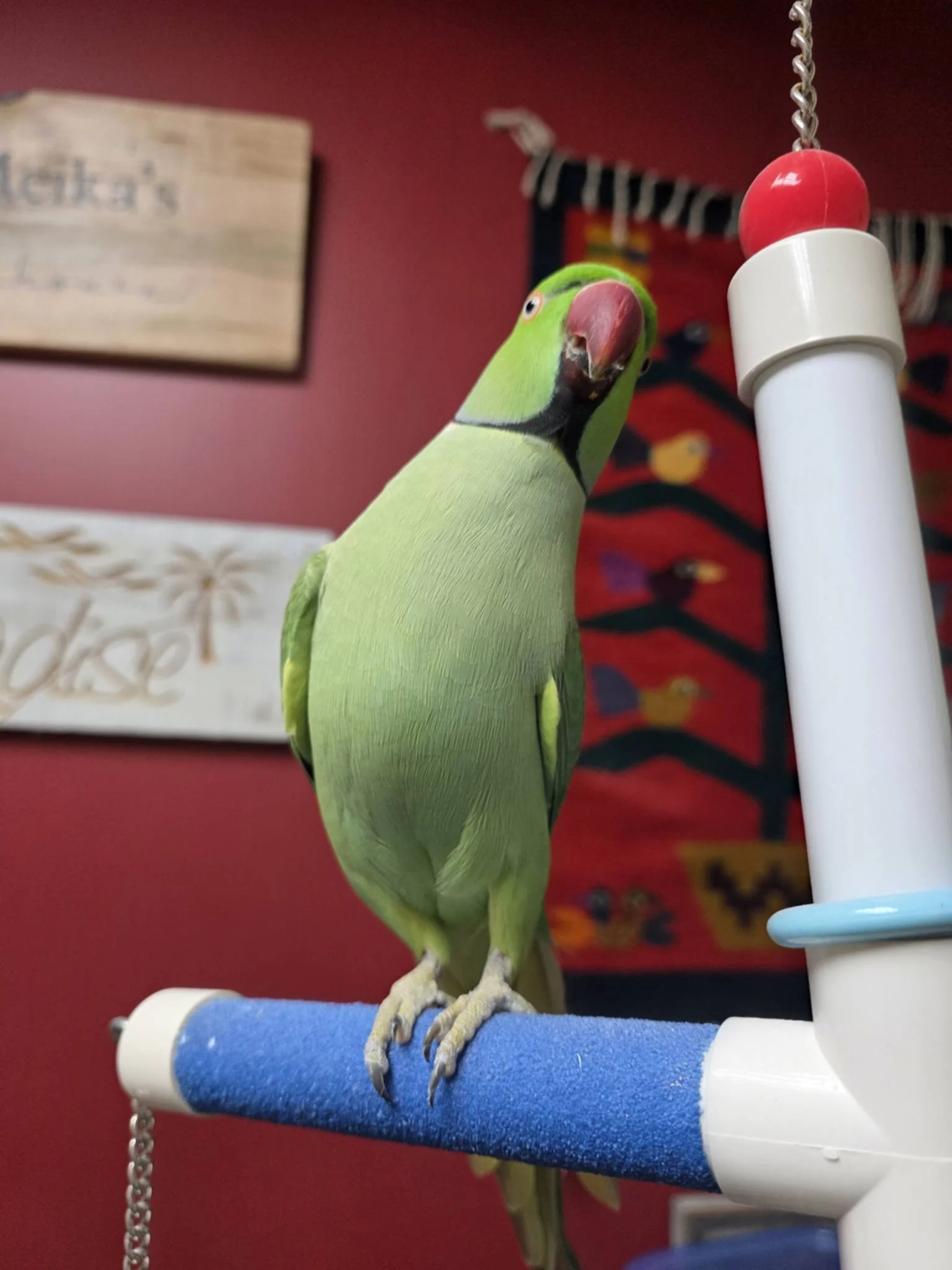 I am a super sweet Indian Ringneck that loves to hang out on your shoulder, squeak some sweet nothings into your ear and engage with my surroundings. I love to play with all kinds of thingsβ¦especially when they arenβt meant for me, so I definitely need to be supervised when I am out of my enclosure. Come meet me, you will fall in love with my charming personality, and I am even better when I know you and am comfortable with you.
