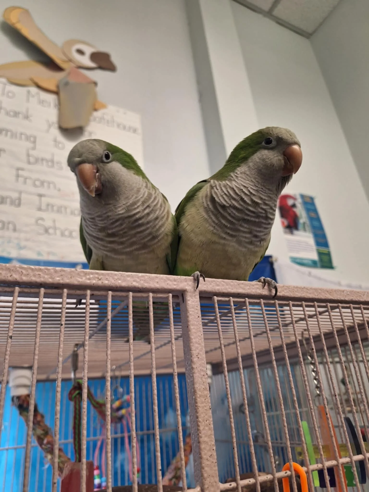 Very Playful, very busy. They will land on your head and shoulders but are quite reluctant to step up on hands so far. Earning trust! They are cage territorial (as a lot of Quakers are) and they have a loud voice when they βsingβ together. They were both found outside and never claimed!