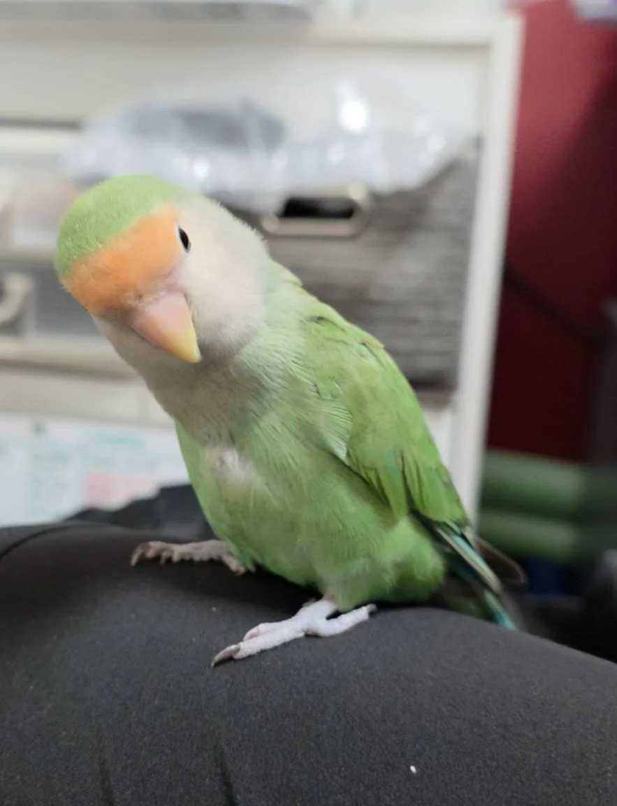 I am a super sweet lovebird that truly likes to be with my people. I am super social and love to hang out on your shoulder or hands. I gently preen your hair, ears, hands and cheeks. I am an egg layer so providing extra calcium in the form of cuttlebone or liquid calcium in my water is a must.