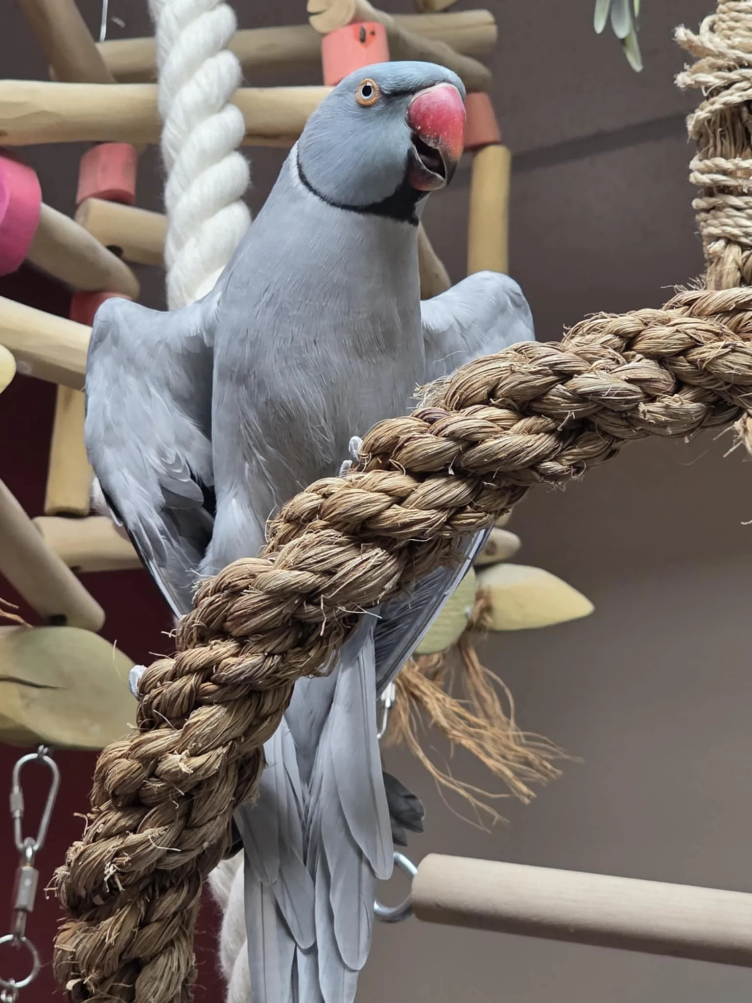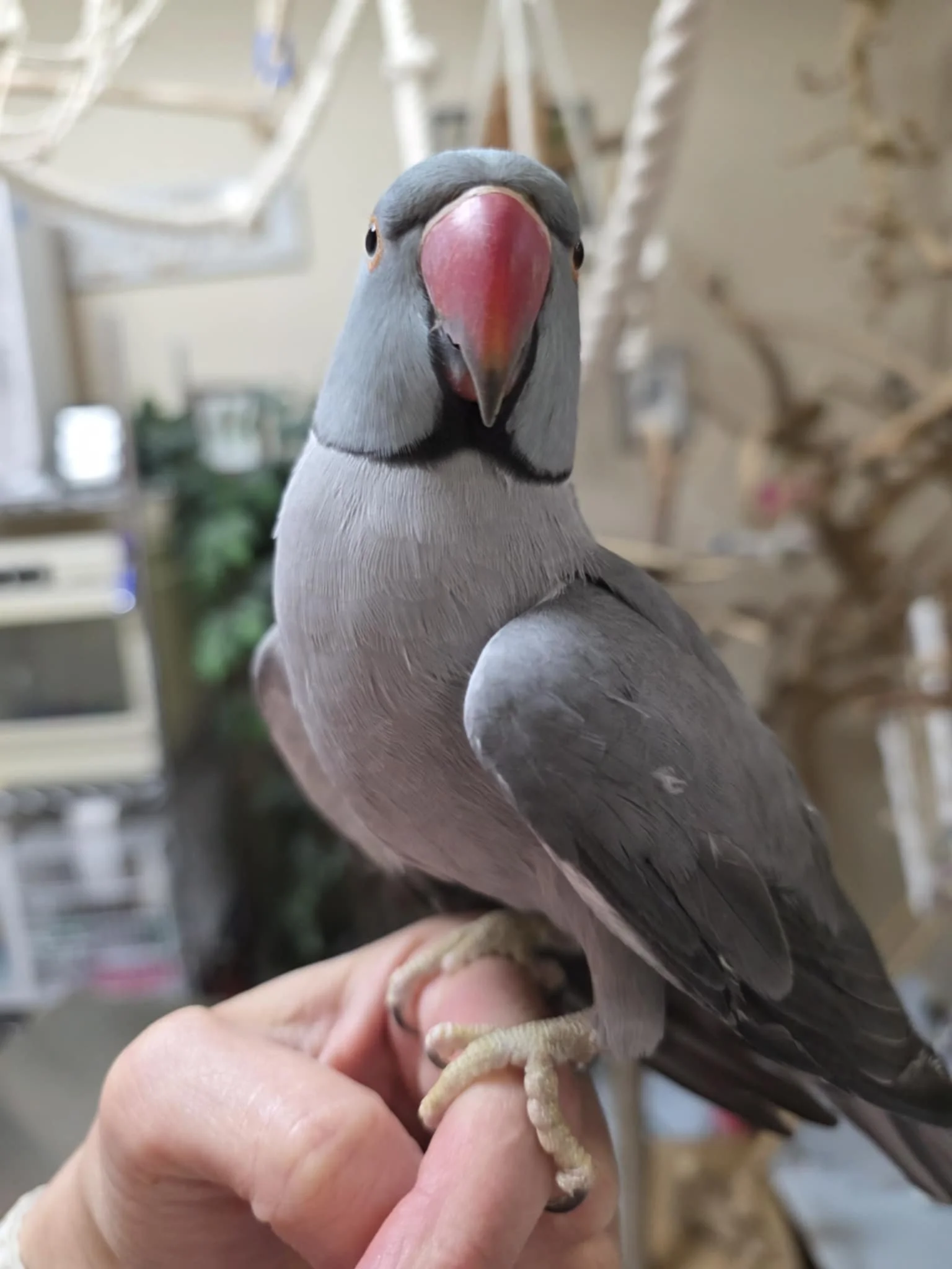 Moby is a sensitive, smart, passionate and fairly confident guy who knows what he wants. He forms strong attachments to things he loves (his chosen person, bird or toy). He prefers women and is a bit skeptical of men, however, trust can be earned with treats and positive interactions. He likes to spend some time with his people doing things, but he also enjoys spending time in his enclosure away from the action, playing and napping. He will get grumpy if he's out for too long or overstimulated. He is generally a good traveller and is used to frequent short trips and hanging outside in his carrier. He is not to be trusted outside, even with clipped wing as he does fly away (Moby was found outside and never claimed a few years ago so he does have a history of flying off). He prefers a backpack style carrier and feels more secure when it's partially covered. He will alarm call if he's not comfortable. He is comfortable cruising around on the floor and he's quiet and subtle about it - watch out for him, he's often close underfoot. He likes most vegetables and enjoys a good skewer of raw veggies. Snap Peas in the pod, peppers (sweet or spicy), carrot and sweet potato are some of his favorites. He is a great forager and will forage for treats, veggies and pellets. He prefers to bathe in a shallow dish under gently dribbling water, or in his water dish. For the right high-value treat (pine nut), he may tolerate being misted, but he doesn't really enjoy it. His favorite toys are anything made of palm leaf, cardboard, sola, balsa and mahogany pods. Bonus if it's crunchy and noisy. He also loves shredding sola balls - They don't last long! He is very smart and learn fast if you have his attention. That said, he also thinks fast - if you're not operating at his speed and reading his intention, he easily gets frustrated and may bite as a result. Moby does not talk. He does best on a lean diet without corn or peanuts.