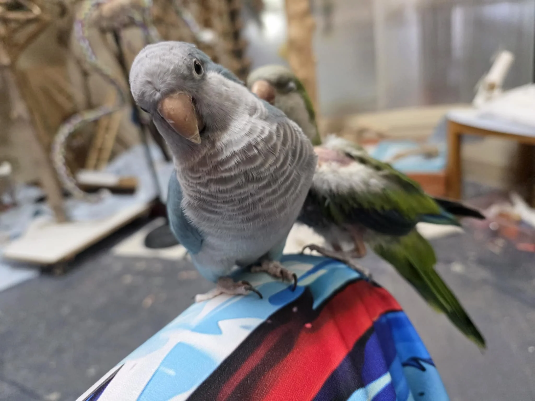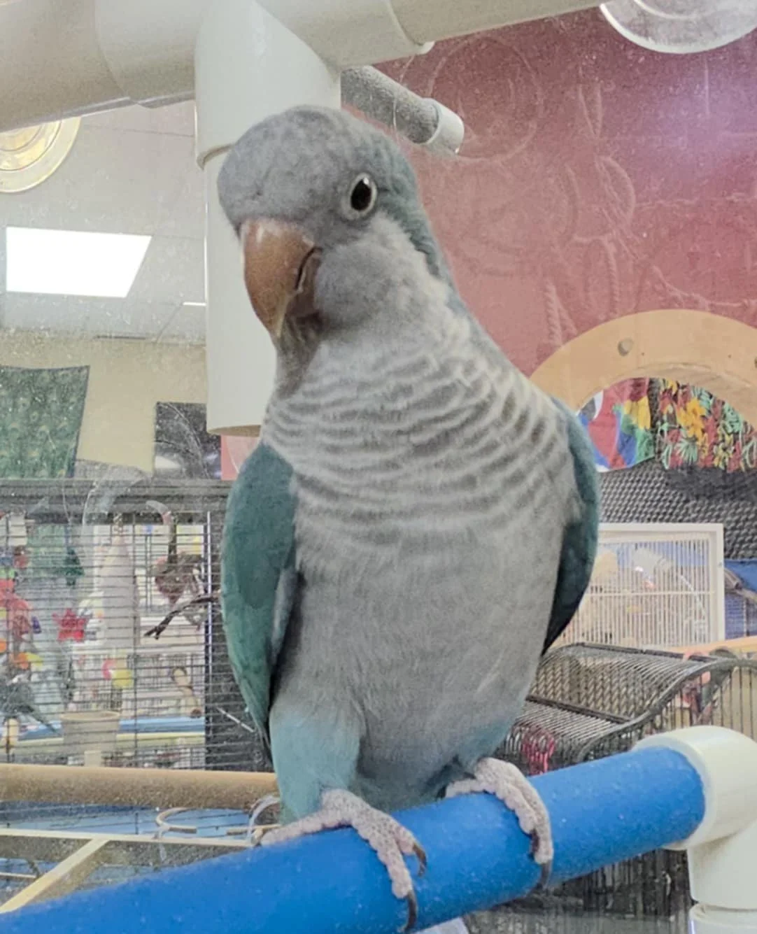 I am a VERY nervous bird, I would even be considered not tame in lots of peoples eyes. Working with me inside the cage so I can gain your trust would be the best way to go. Although if you do let me out of the cage, I am curious enough to want to know where you are and I will take safflower out of your hand. I am the type of bird that you will feel so proud of when I open up to you! Just go at my pace, and I will blossom. I pair nicely with Eddie the Quaker and I learn and feed off his confidence. I would be suitable in a quiet home with no kids and possibly one other bird.