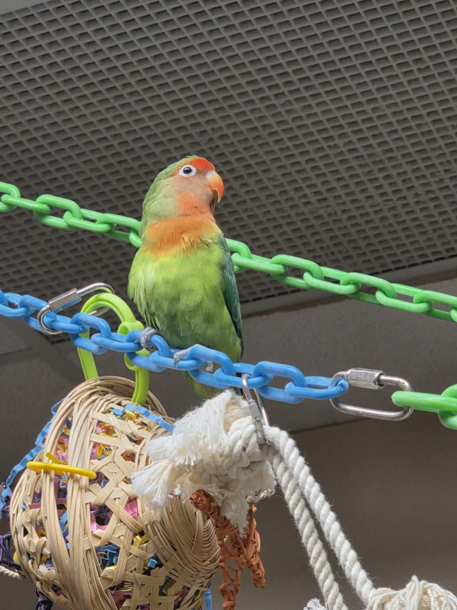 Iβm a pretty little hybrid lovebird. Iβm not tame, but I have a big personality and a love for exploring new territory. I do like people, I am just scared of hands and wonβt step up for you unless there is some major bribing with me favorite treats.