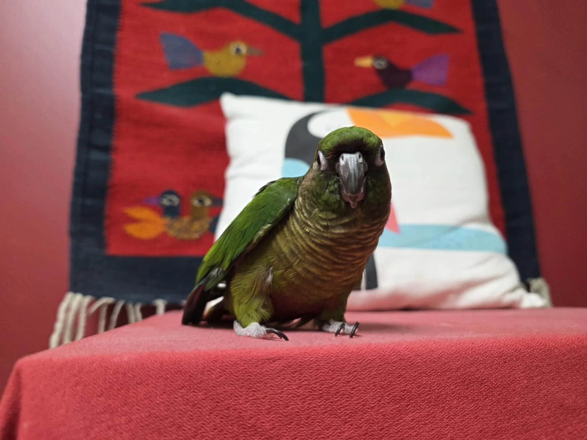 He is a transfer from another agency, and was part of a group of 8. He does not like to step up all the time and will fly away if approached too fast. If you're sitting quietly he will come to see what's going on and will land on your head.