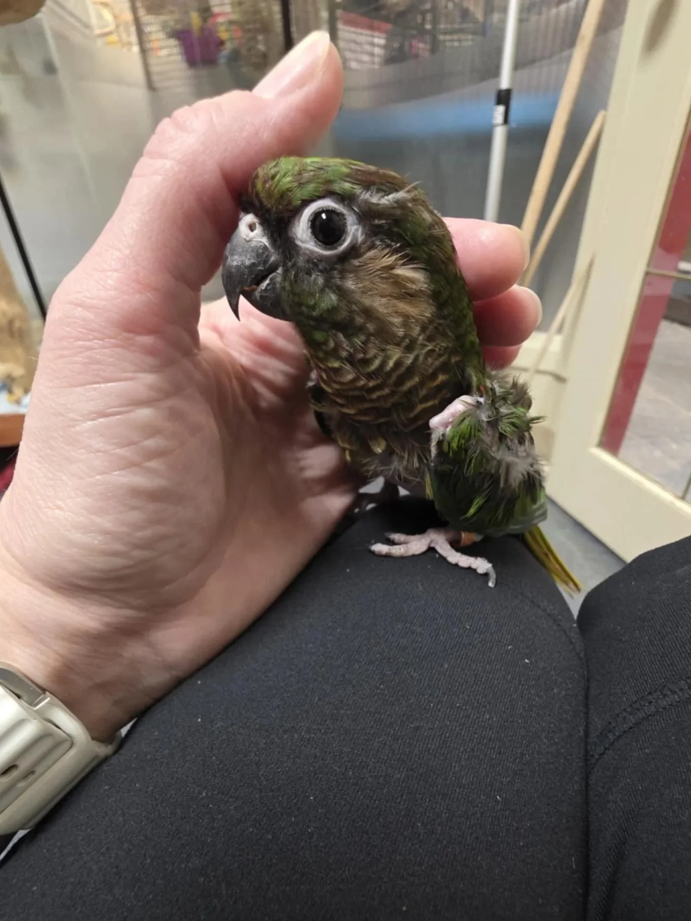 Trixie is a nice little conure that's had a bit of a tough go. She is a chronic feather plucker and has damaged almost all her follicles where she plucks, resulting in permanent feather loss.